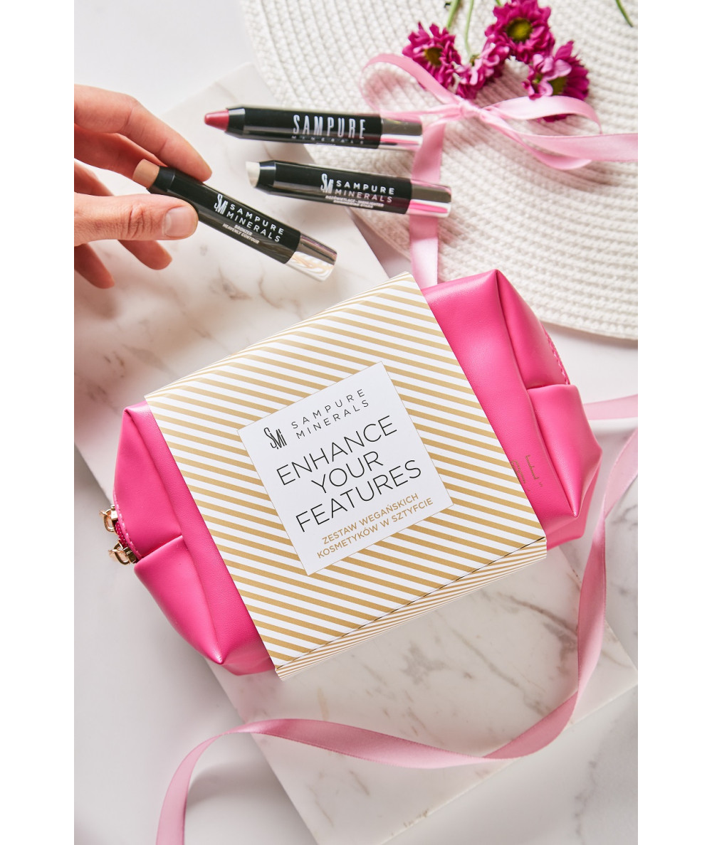 Zestaw kosmetyków do makijażu w kosmetyczce. W zestawie znajdziesz trzy produkty w sztyfcie: